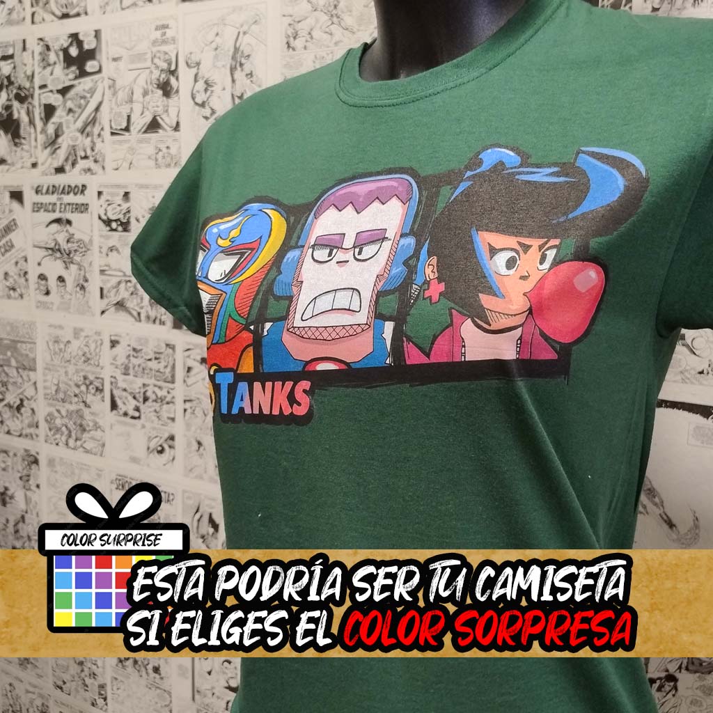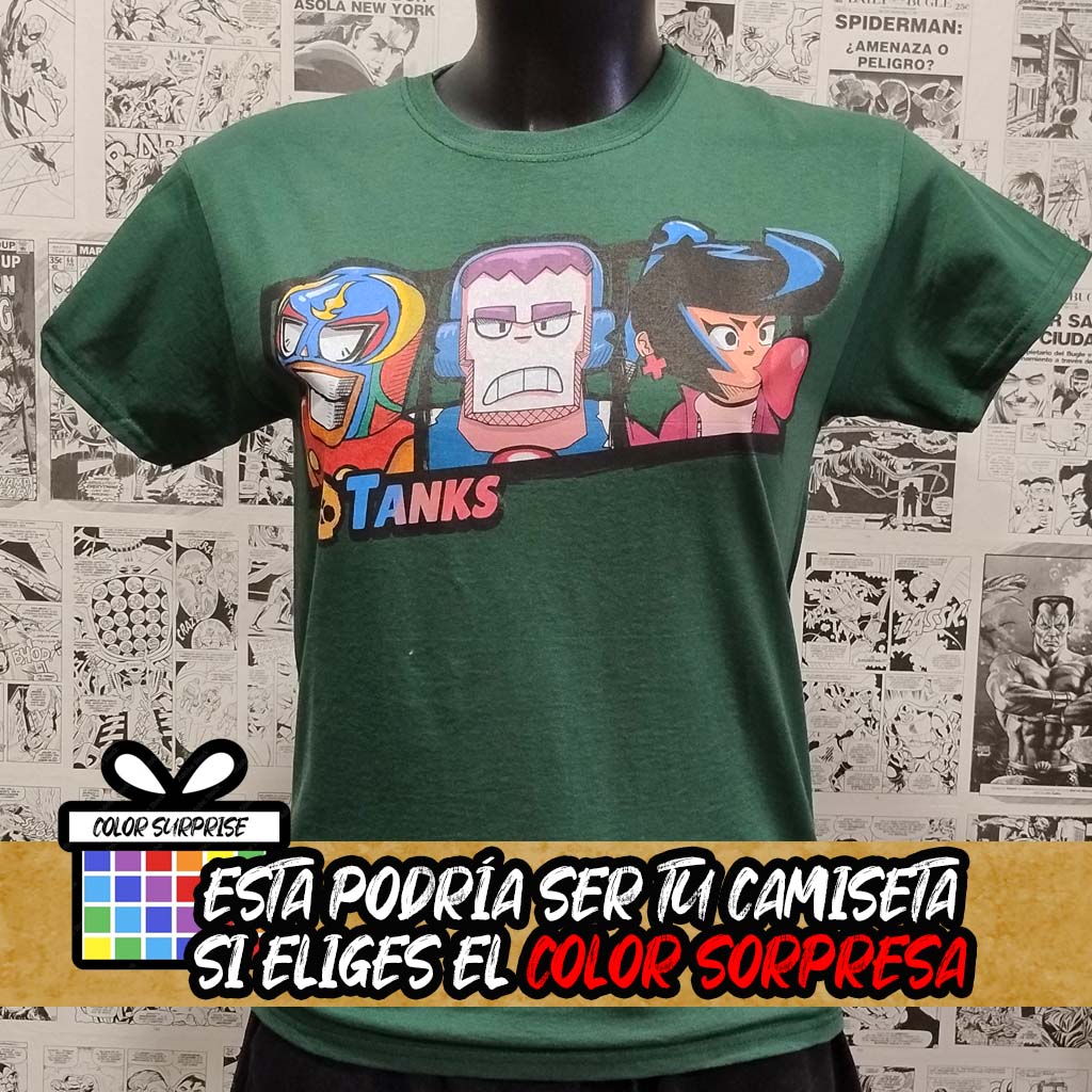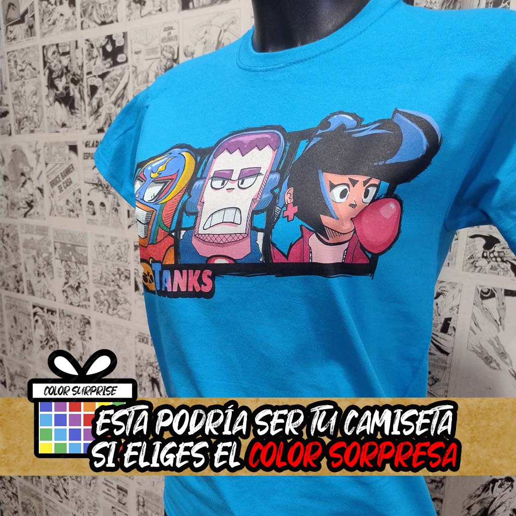 ¡Aplasta a la competencia con la camiseta del videojuego Brawl Stars Tanks! Con los personajes Frank, Bibi y El Primo, tendrás el poder de los tanques a tu alcance. Únete a la batalla con esta camiseta única inspirada en Brawl Stars. ¿Estás listo para ser el mejor? ¡A por tus Brawlers preferidos!