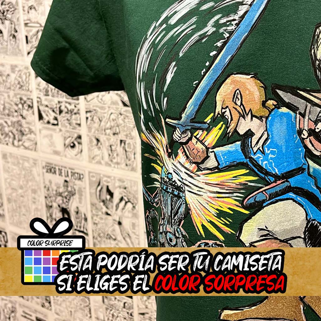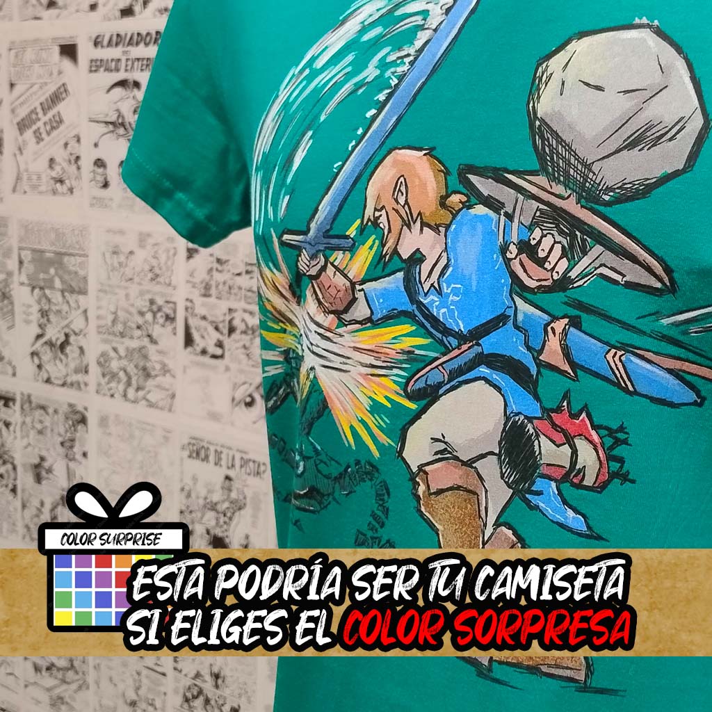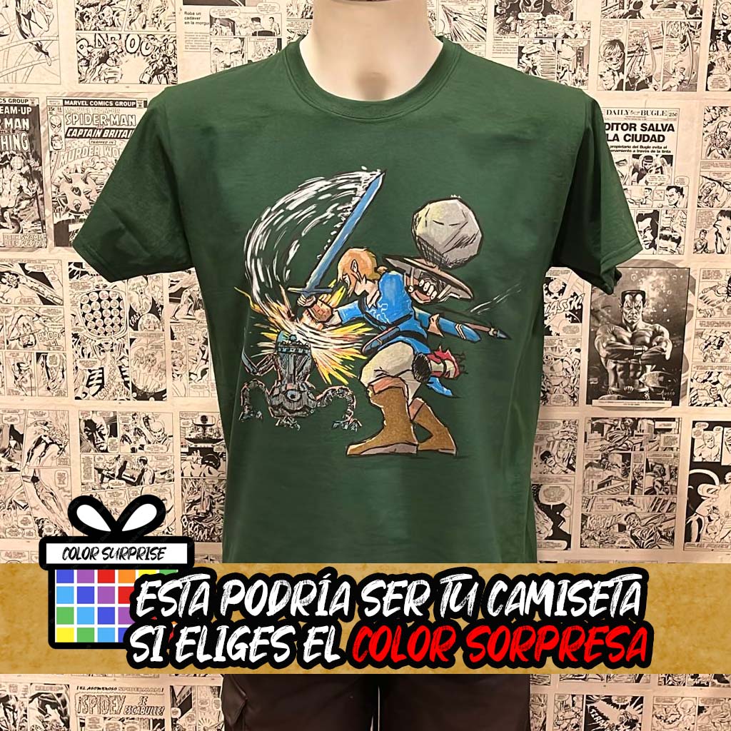 ¡Únete a la acción con esta camiseta original de Link! Luce a tu personaje favorito del videojuego Zelda en su épica batalla contra el guardián. ¡Una prenda imprescindible para verdaderos fanáticos de la serie!