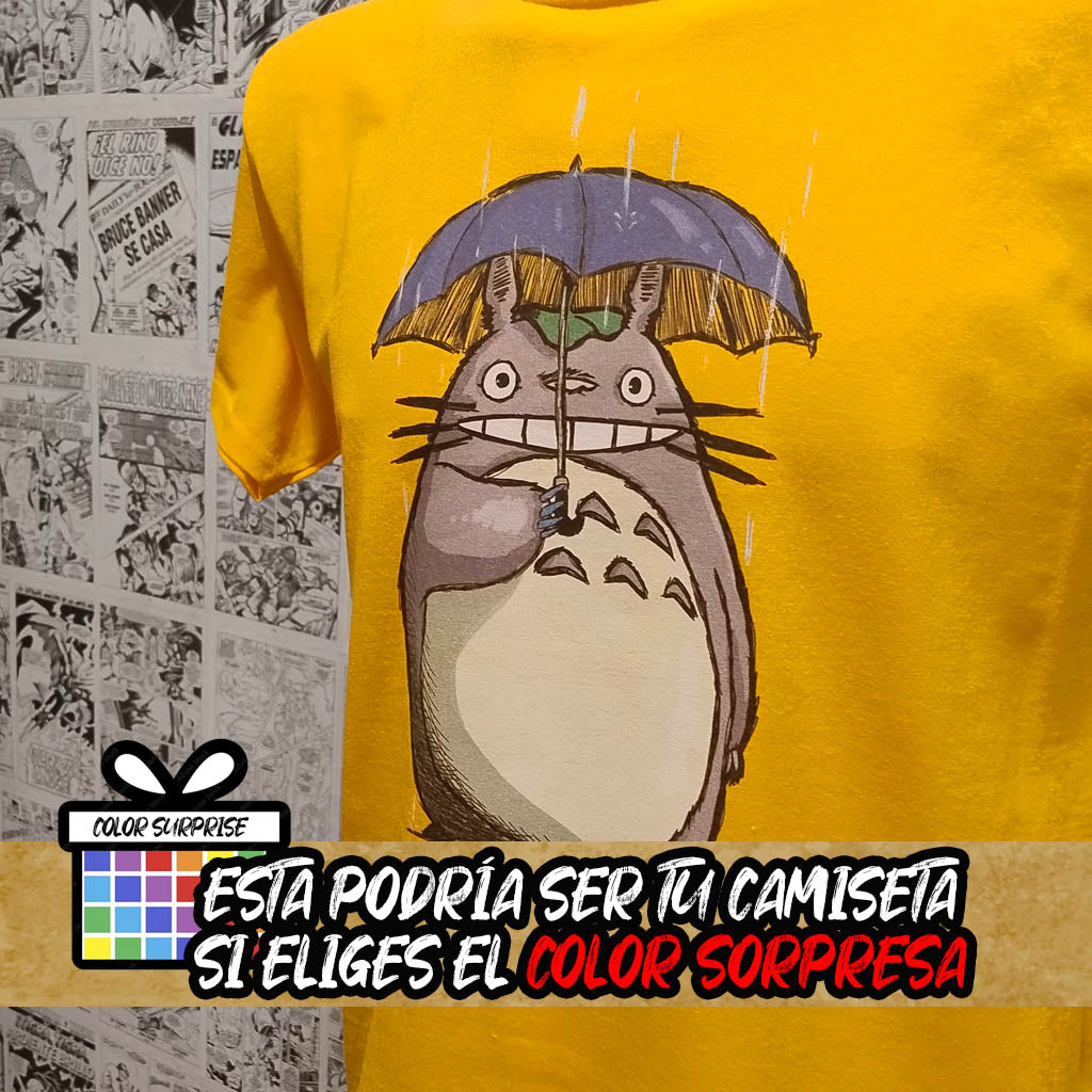 Camiseta inspirada en las películas de Studio Ghibli, con la imagen del icónico Totoro bajo la lluvia con su paraguas. Lleva la magia y la alegría de los clásicos del estudio en tu estilo con esta prenda emblemática.